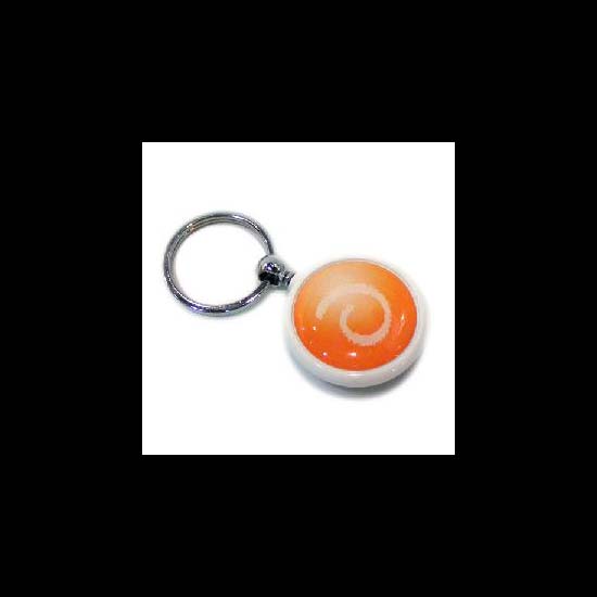 The metal hoop on the keychain is linked to a circular plastic decoration piece