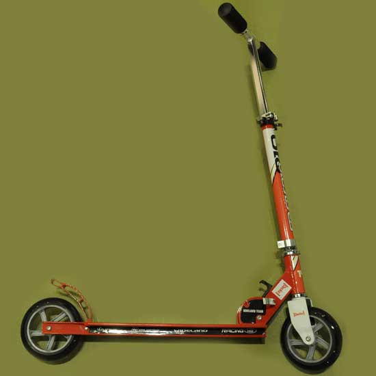 Showcased is a kick scooter with a sturdily constructed aluminum body. The handlebar is padded with soft plastic for comfortable play. The rear wheel features an easy brake for quick stopping.