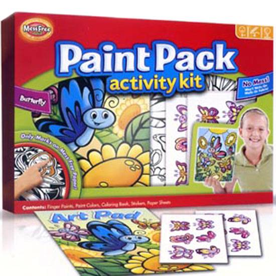 The featuring item is a painting set for kids and children to train their creativity and artistic skills. The set consists of finger painting colours, a colouring book, stickers and paper sheets.