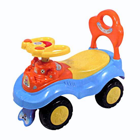 This kiddie car features a funny castle theme in delightful colors. There is a music button to provide extra fun. The seat can be opened for the storage of toys.
