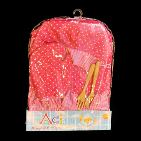 This kids' baking set includes a red dotted apron, an oven gloves with a wooden fork and spoon. The fabric apron and oven gloves are durable and easy to wash. This great kids' baking set is a perfect gift choice for your little one.