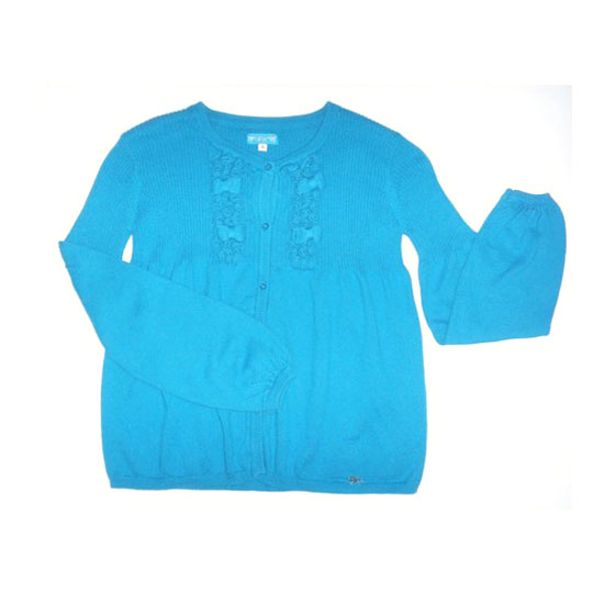 Featured here is a long-sleeve cardigan for kids. The delicate knot embellishment offers a pretty look. The vivid light-blue finish easily captures attention from the crowded.