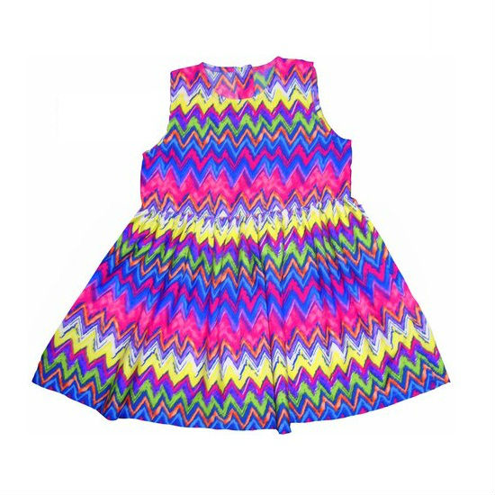 This is a kid’s sleeveless dress in bold and vibrant shades. It features multi-colored zigzag pattern all over for a touch of flair. The dress falls into the category of a fit-and-flare one with delicate gathered details along the waistline. Style this adorable dress with a pair of sandals and a denim jacket for a casual look.