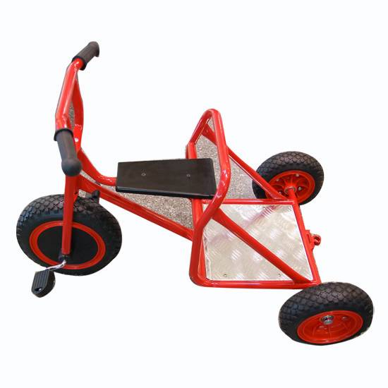 This kids' trike comes in red and black colors. It features a sturdy steel frame, blow-molded rubber tires with tread strips for an extra grip, and a rear storage space for traveling with the kid's favorite toys.
