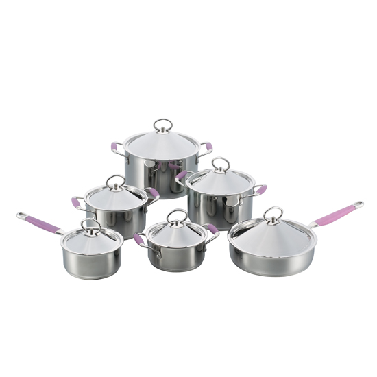 The stainless steel cookware possesses a glistening silvery finish. All pink lacquered handles give the special splendor on this kitchen utensil, while all lids adopts a cone shape with a large shining ring, appealing to users with its brilliant design.