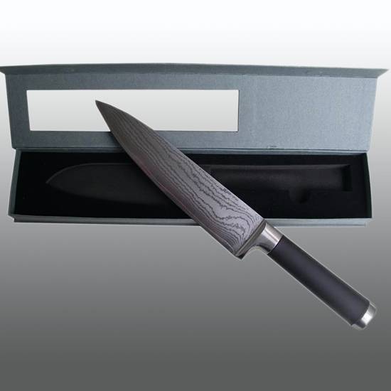 This kitchen knife features an exceedingly sharp and long-lasting cutting edge. Each side of the blade is clad in 33 micro-thin layers of high-carbon stainless steel, which form a virtually rustproof Damascus-style variegated surface.