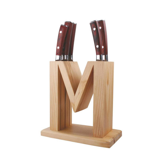 This well-designed set comes with 5 knives and a wooden stand. The stand is styled into the shape of the letter M for a stylish touch. This excellent set is great for both professional and household kitchens.