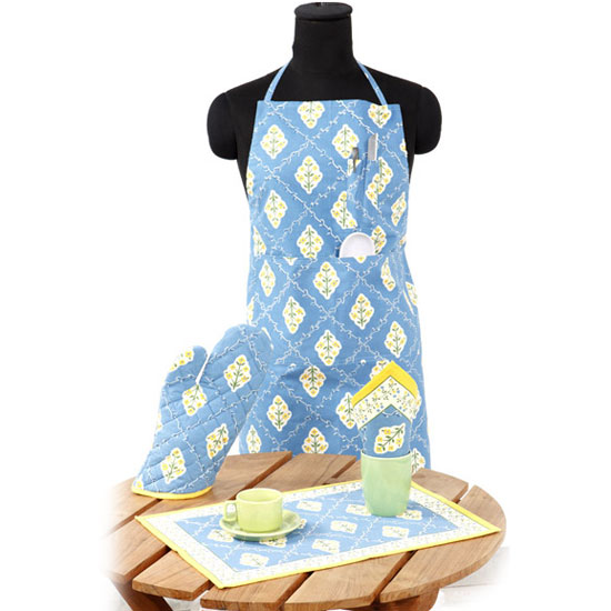 Pictured is kitchen linen set touting a soft blue finish, which is printed with white flowery details to present rhombus patterned design. The kitchen set includes an apron, a mitten, a place mat and a napkin for added versatility. This kitchen linen set is made with cotton fabric to reveal exquisite craftsmanship.