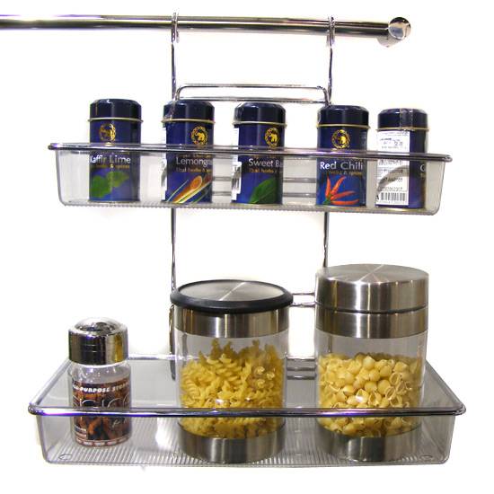 The featured item is a rack ideal for kitchens. It comes in a hanging rack form with two decks. It is ideal in kitchens for storing ingredients, spices and other dried goods.