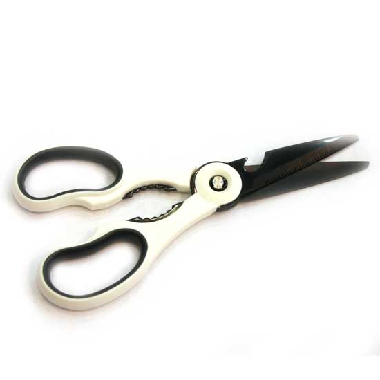 This pair of stylish scissors features a black and white appearance. The sharp metal blades are coated with black titanium for added durability. The ergonomic handles guarantee a secure and comfortable grip.