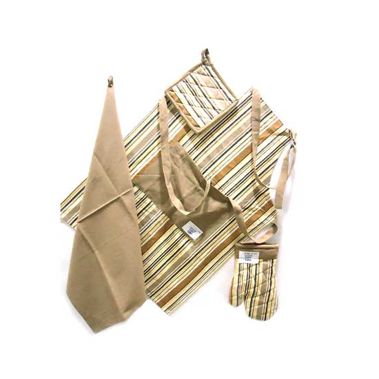 This kitchen linen set contains an apron, a glove, a pot holder and a kitchen towel. The neat stripes add a chic touch to the look. Made of pure cotton, this kitchen linen set is surely comfortable to use.