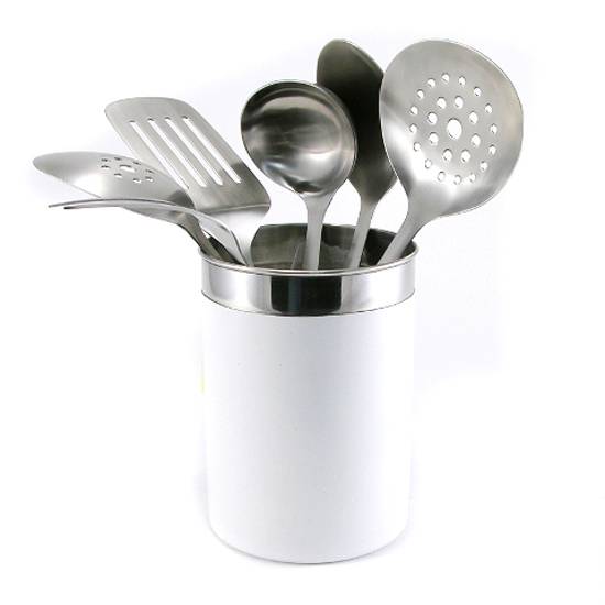 This is a stainless steel kitchen tool set with a cylindrical holder. This set comes with six pieces of kitchen tools. It is a good way to organise the kitchen tools systematically and they are all durable and easy to clean.