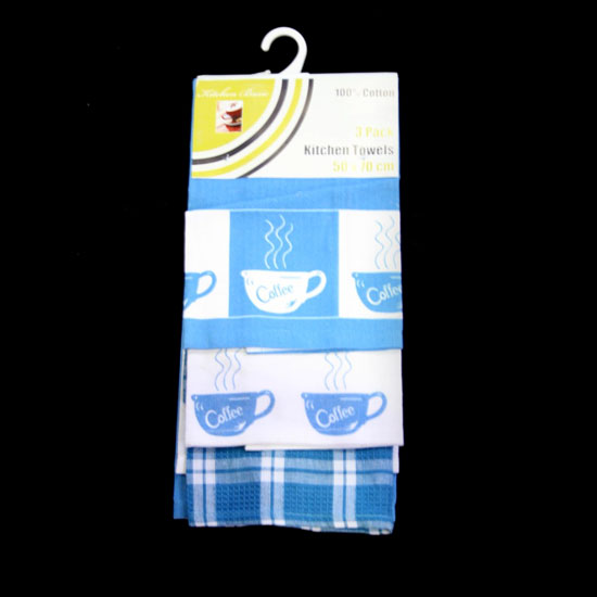 The picture displays a 3-piece kitchen towel set in a delicate 2-tone design. Finely woven of 100% cotton, the towel is machine washable for easy care. Keep your kitchen clean and tidy with this durable kitchen towel!