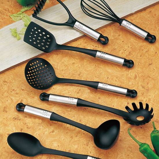 - Kitchen utensils include ladles, turner, spatula, serving spoon, egg beater