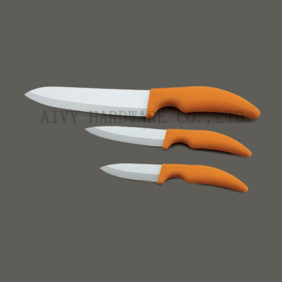 This is a kitchen knife set that includes 3 different pieces. Each piece features a sharp white blade. The ergonomic handle promises a comfortable grip.