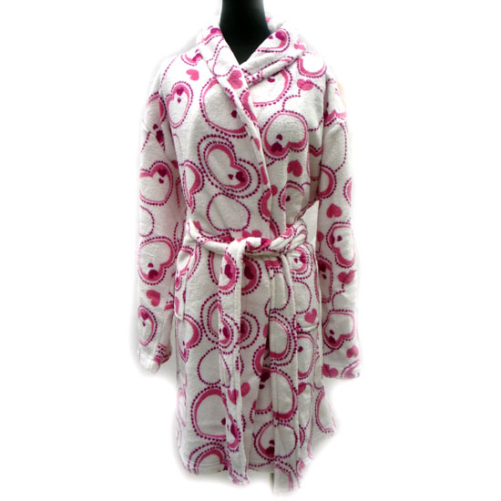 Featured is a bathrobe made with soft polyester for a comfy touch on the skin. The knitted coral fleece surface is accented with pink heart-shape patterns. The bathrobe makes an intimate gift for your beloved one.