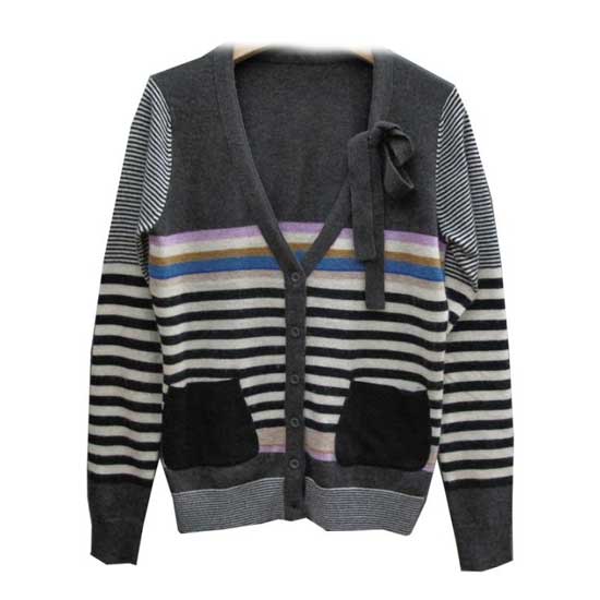 This V-neck knitted cardigan features different striped patterns in assorted colors with a sense of vogue. The bow embellishment lends extra style to the appearance. This beautiful cardigan is finished with a button closure.