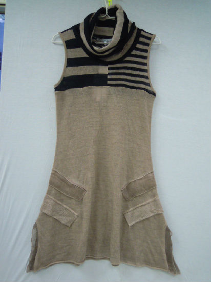 This ladies' knitted dress features horizontal stripes on the neck and chest, sewing lace pocket facing for decoration and has vents on the hem.