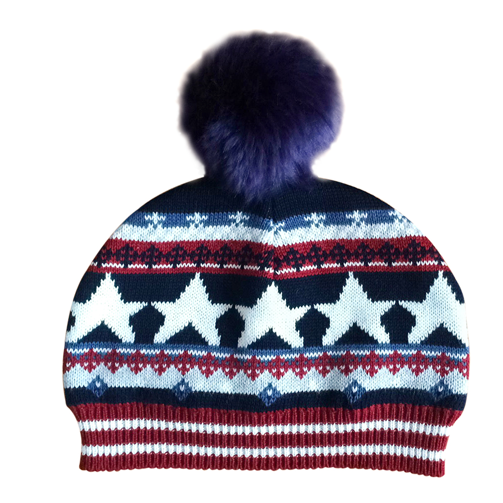 100%Acrylic jacquard hat w fake fur pom&full fleece lining