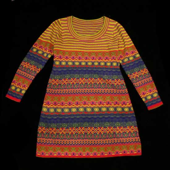 As shown is a ladies’ knitted top coming with a slim hip-length cut. The top boasts beautiful computer jacquard patterns. The sharp combination of colors and patterns look sweet and trendy for winter.