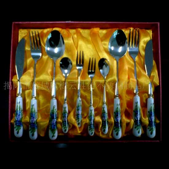 This ten-piece Korean tableware set is finely packaged in a gift box lined with golden-toned satin fabric. The ceramic tableware handles are adorned with beautiful flower and leave patterns. The metal tableware heads showcase a mirror finish with long-lasting shine.