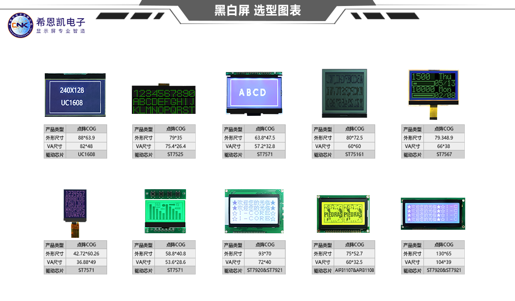 Include segment, character, graphic LCD modulesCover TN/HTN/STN/FSTN/DFSTN LCD & COG, COBCustom shapes, sizes, interfaces, etc.High contrast, low power, wide temperatureTouch available, VA full view, multi-colors silkFit applicatons of automobile, industrial, etc.
