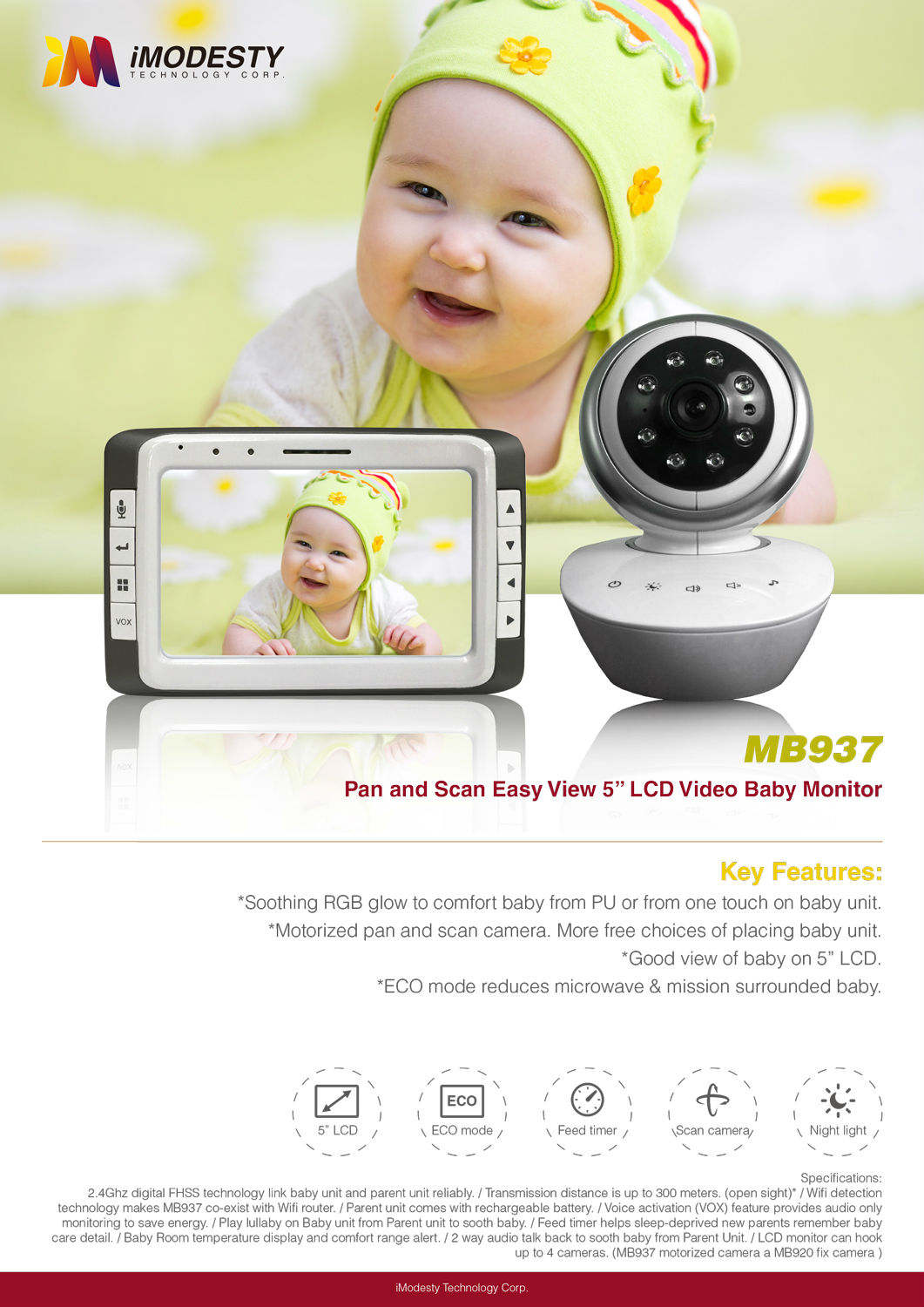 • 2.4GHz digital FHSS technology link baby unit and parent unit reliably.Transmission distance is up to 300 meters. (open sight)Wi-Fi detection technology makes MB937 co-exist with Wi-Fi router. Parent unit comes with rechargeable battery. LCD monitor can hook up to 4 cameras. Optional features: Talk Back, Room Temperature display, Lullaby and Nightlight.