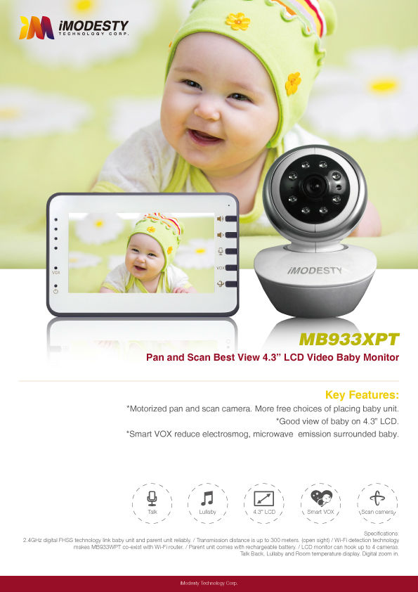 2.4GHz digital FHSS technology link baby unit and parent unit reliably.Transmission distance is up to 300 meters. (open sight)Wi-Fi detection technology makes MB933WPT co-exist with Wi-Fi router.Parent unit comes with rechargeable battery.LCD monitor can hook up to 4 cameras. Talk Back, Lullaby and Room temperature display. Digital zoom in.