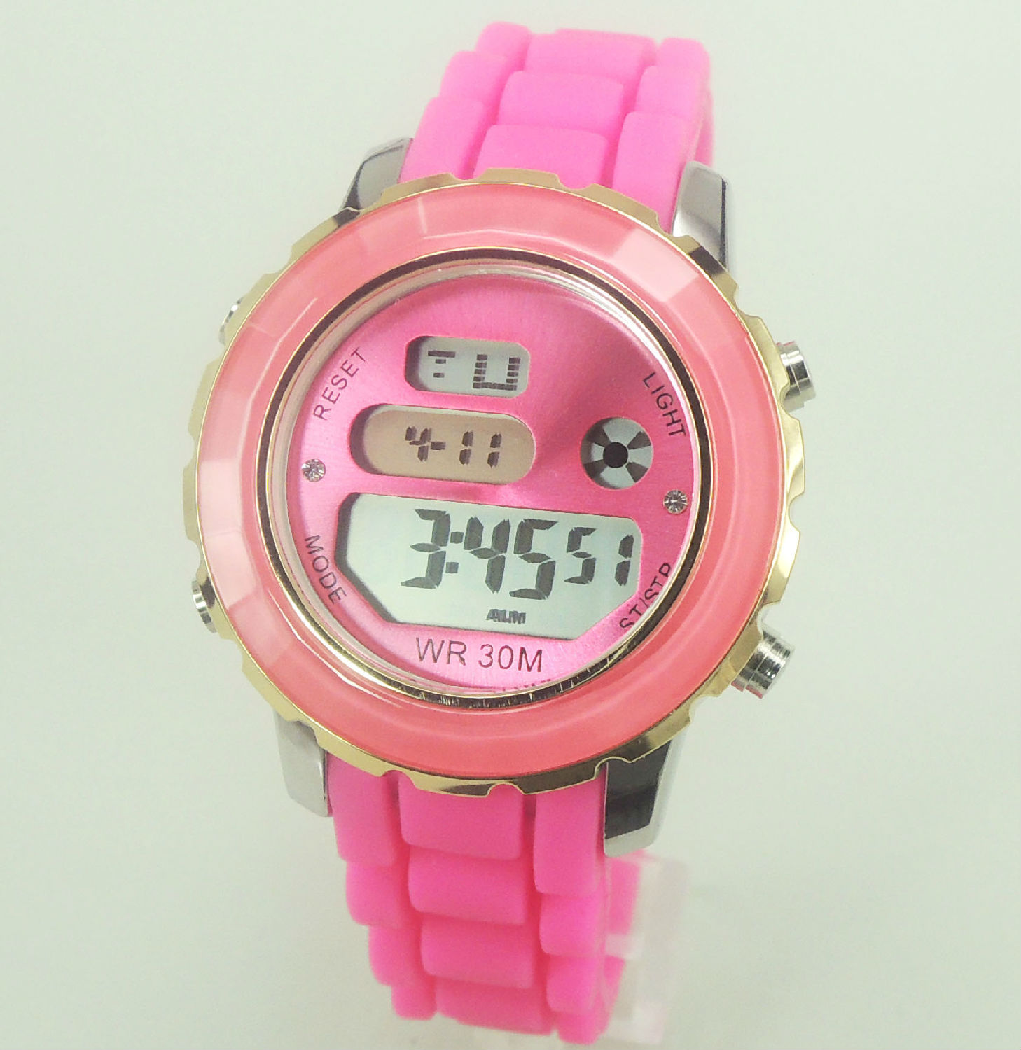 Alloy Case with diamond cut glass, Silicon strap, 3 ATM Water Proof, Plating IPS/IPG, Movement LCD