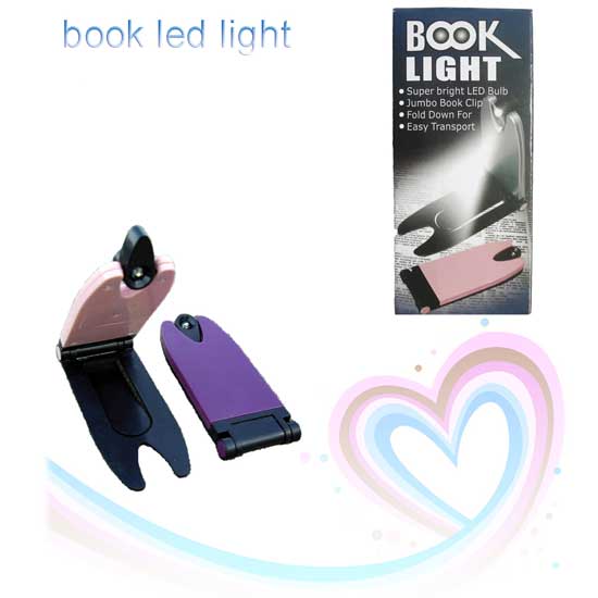 Displayed is an LED book light featuring a slim and flat figure. Available in two colors, this book light can also be used as a book clip and can be folded for easy transport. This handy LED book light will be of great help for your better enjoyment when reading.
