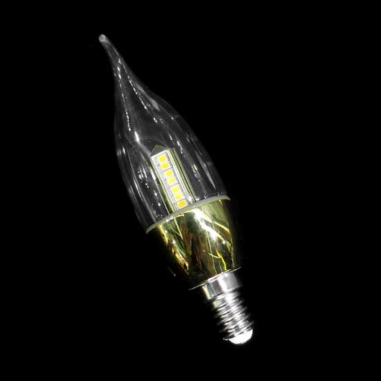 This slim candle bulb is fitted with quality LEDs for super brightness. It comes with a transparent clear cover and a shiny golden-hued band for a chic touch. This energy saving LED bulb is great for indoor lighting.
