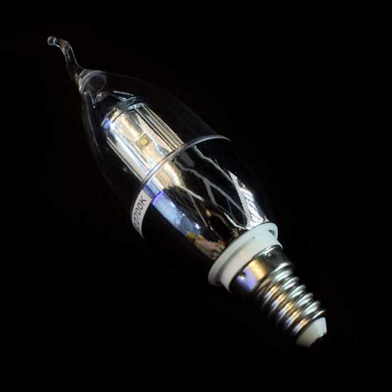 The displayed LED light bulb features a candle shape with metallic finishes for added durability. Classic screw base ensures easy installation for users. This high efficiency LED light bulb makes an excellent alternative to tradition light bulbs.