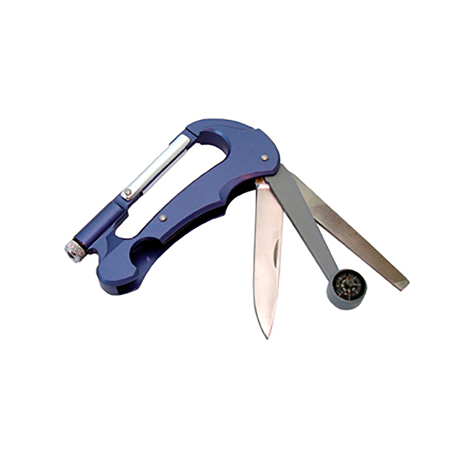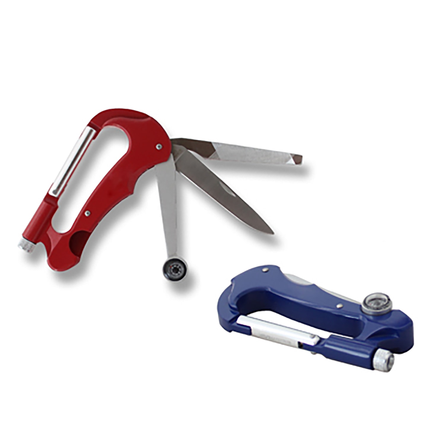 The carabiner pocket knife multi tool with LED flashlight includes the following features: