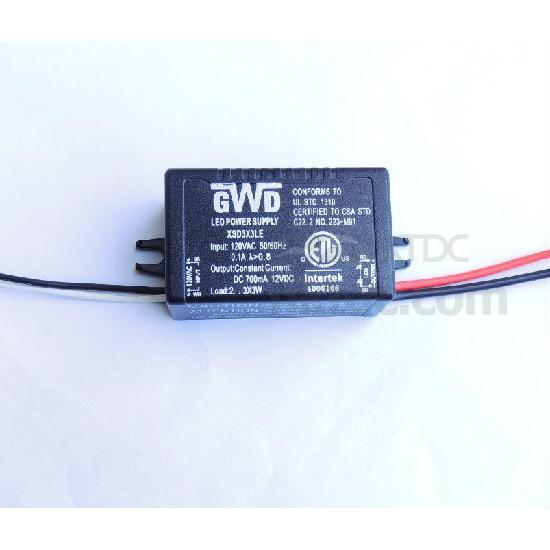 - XSD3*3LE 120V~50/60Hz 6.5-12VDC 700mA 2-3*3W 50℃ 85℃ >75% <0.1W >0.82 √ IP 65 74x34x23.