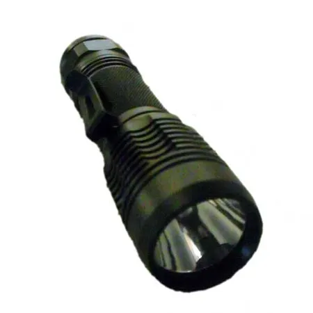 Available is an all-black flashlight with a textured surface for a firm grip in the hands. The flashlight can be used during camping, hiking or other night-time activities. The LED light source provides exceptional brightness.
