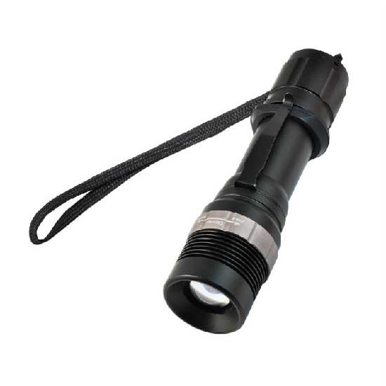 This LED flashlight features a sturdy aluminum alloy housing in a black finish. The top-performance flashlight emits an intense beam to light up the path. The focus of the flashlight is adjustable.