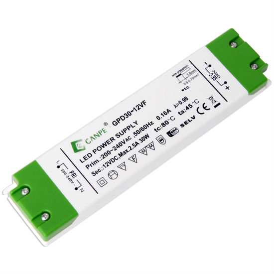 This LED power supply has an ultra-thin casing and can be installed in most furniture. It has a long rectangular housing with electrical data displayed on the exterior. It is suitable for general lighting applications and provides a high reliability.