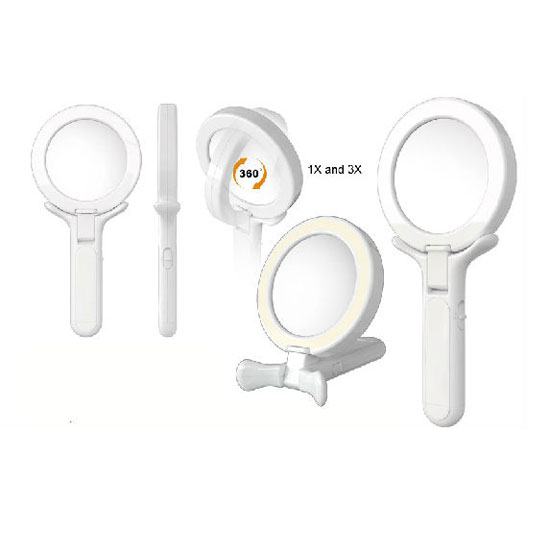 This mirror features a normal mirror on one side and a magnifying mirror on the other side. The finely manufactured mirror delivers clear reflected images. The LED mirror runs on 3 AA-sized batteries.
