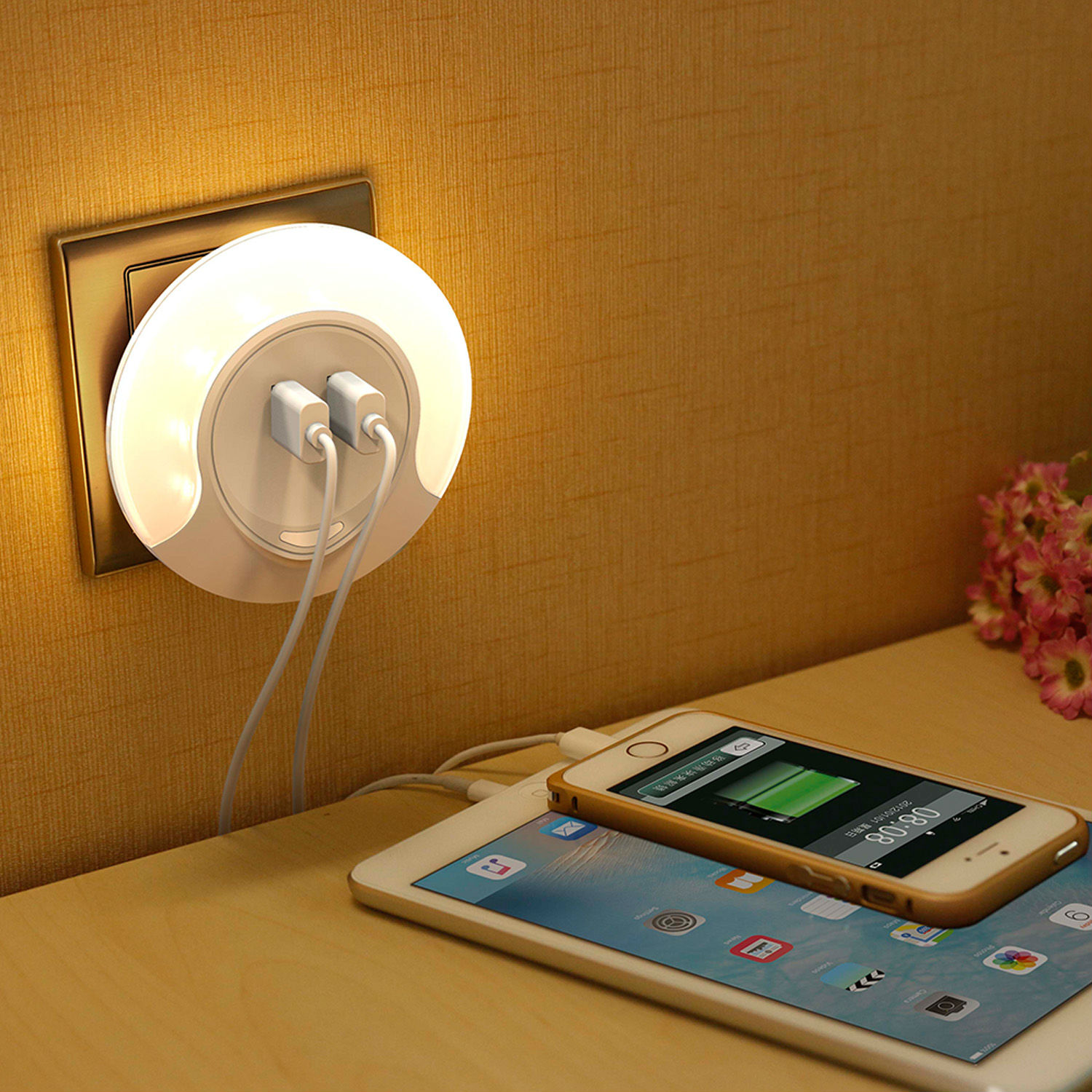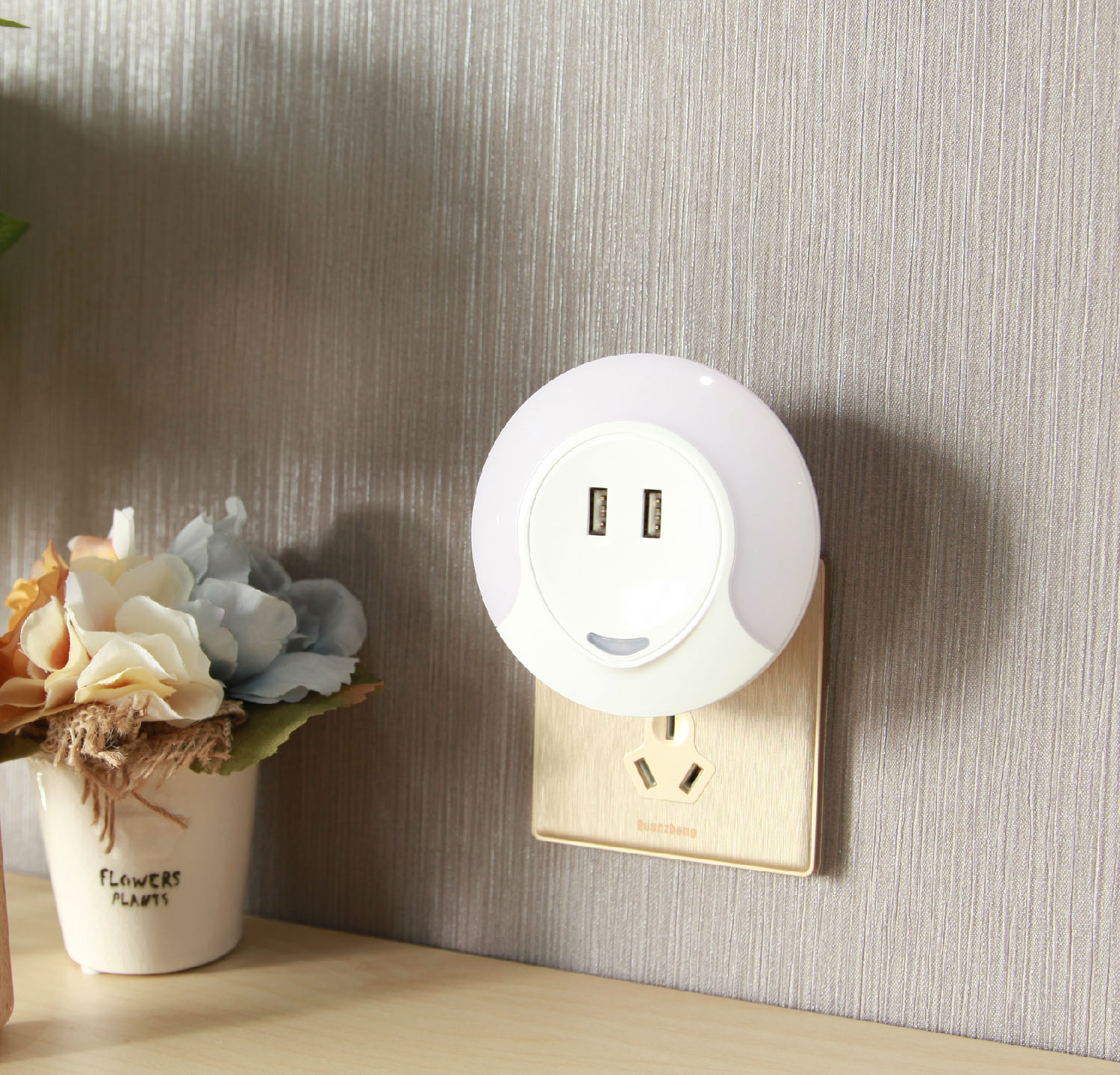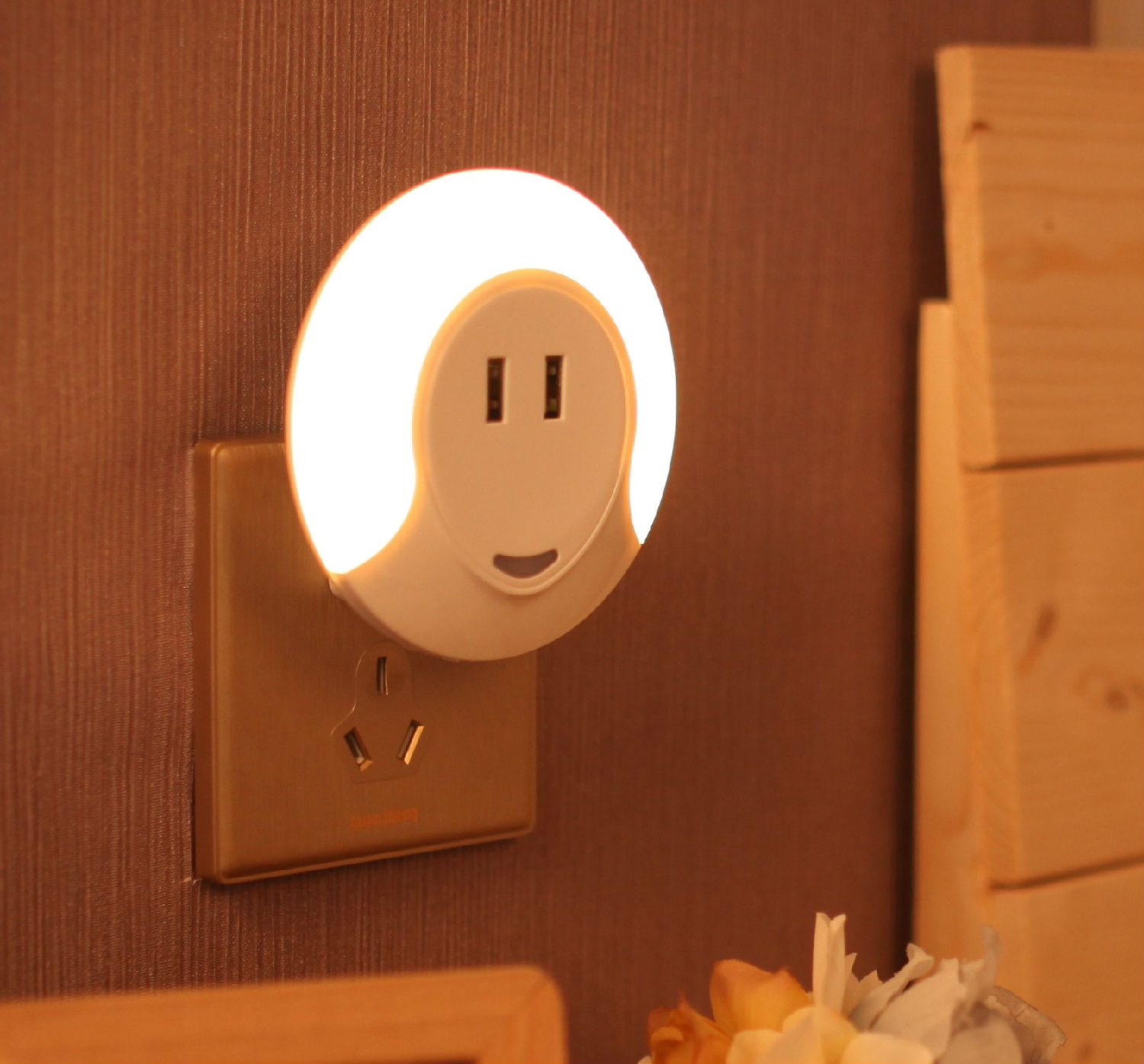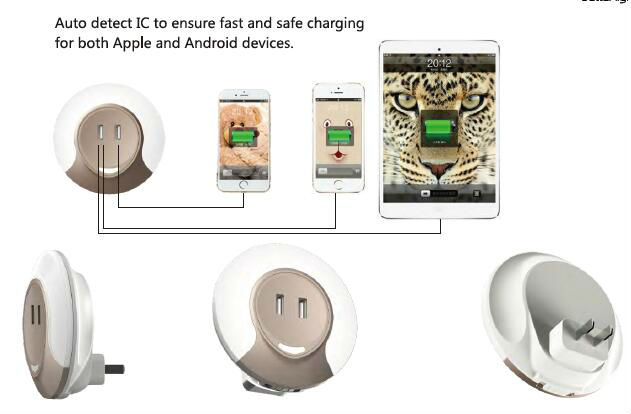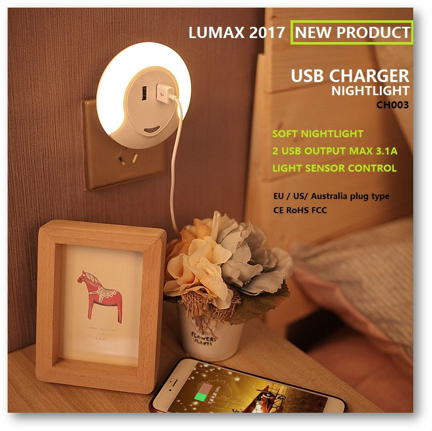 The pictured night light comes in a round shape and has 2 USB output ports for charging cellphones and other USB devices. It is equipped with eight 2835SMT LEDs and provides soft and comfortable illumination. This night light comes in a compact travel-ready design and has a sensor for automatic dusk till dawn operation.