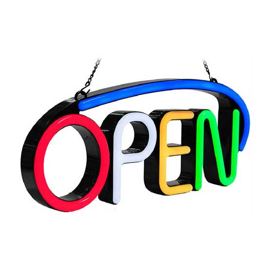 This colorful LED sign imitates the shape of a neon sign. The well-designed open sign is stylish and colorful. It is sturdily constructed for a long service life.