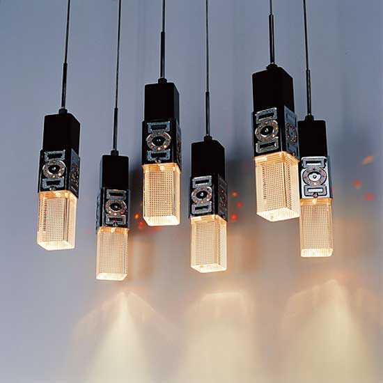 Showcased is a pendant lamp coming with 5 suspended heads. Each head comes in a rectangular-tube shape with a glass lampshade. The black base is adorned with shiny patterns and holes to let light go through for a special effect.