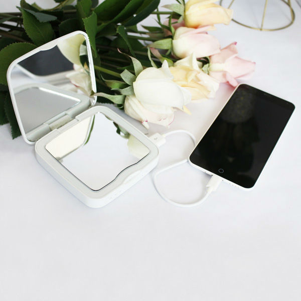 Highlighted here is double-sided LED cosmetic mirror with power bank. The cosmetic mirror has a 5x magnifying mirror on one side and a regular mirror on the other side. It is equipped with a powerbank at the bottom and has a 3000mAh lithium battery for charging.