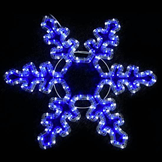 The LED snowflake motif features blue illumination with a twinkling effect. It is made of 10mm mini rope light with horizontal inserted bulbs. This snowflake motif makes a great decoration for festivals and parties.