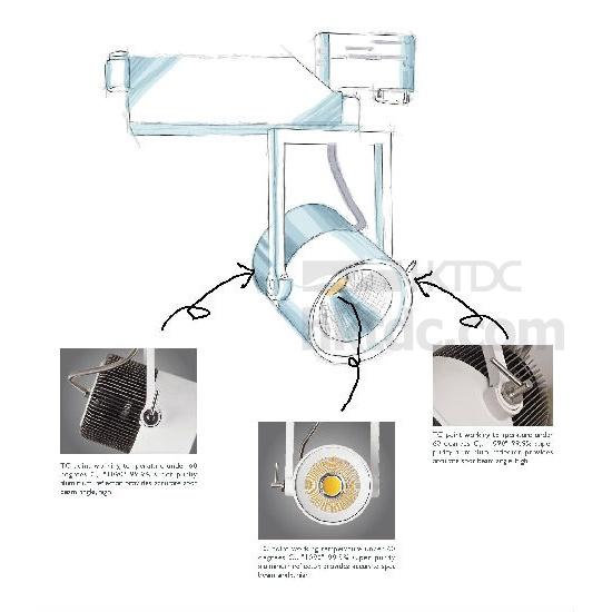Track mount adjustable spot with high power LED, die-cast light body made by high grade ADJ-12 aluminum under environmental protection control, active cooling system build with custom metal heat sink & high speed/low noise fan acoustic noise 18.2dB (A), identically offer excellent cooling result LED TC point working temperature under 60 degrees C. "1090" 99.9% super purity aluminum reflector provides accurate spot beam angle, high luminous flux output and excellent color rendering.