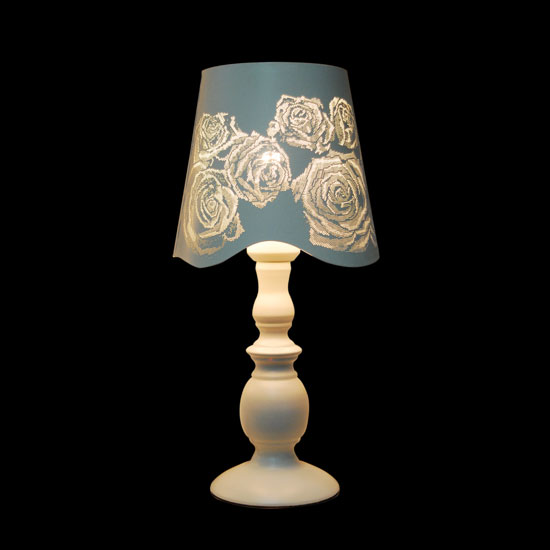 Displayed is an LED table lamp featuring an elegant design. With a curving rim, the cylindrical blue shade is highlighted with oversized floral patterns. The solid white base exudes a pure and minimalism touch.