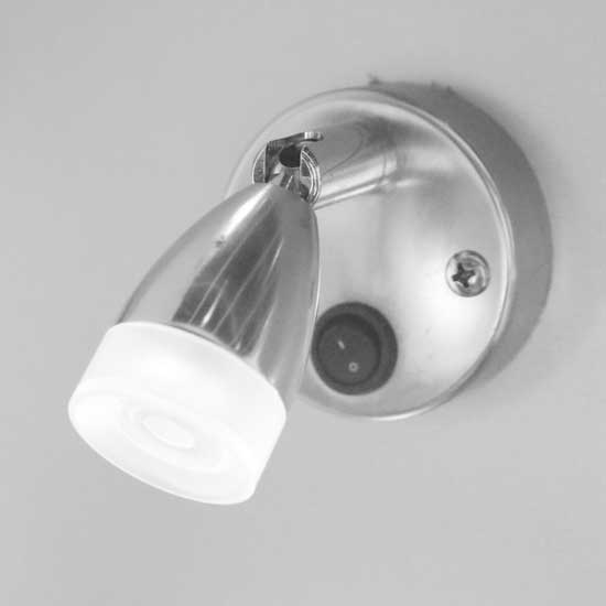 This LED wall light features a circular base with a cone-shaped light head. The metal housing showcases a polished finish. The compact wall light can be easily mounted on the wall.