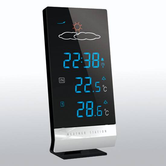 Featured is a weather station clock with a Blue LED screen, providing a stylish temperature and time display. It comes with a DCF radio-controlled clock with a backup quartz clock for precision of timekeeping. This fantastic clock would make a stunning feature for any room.