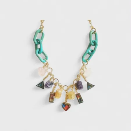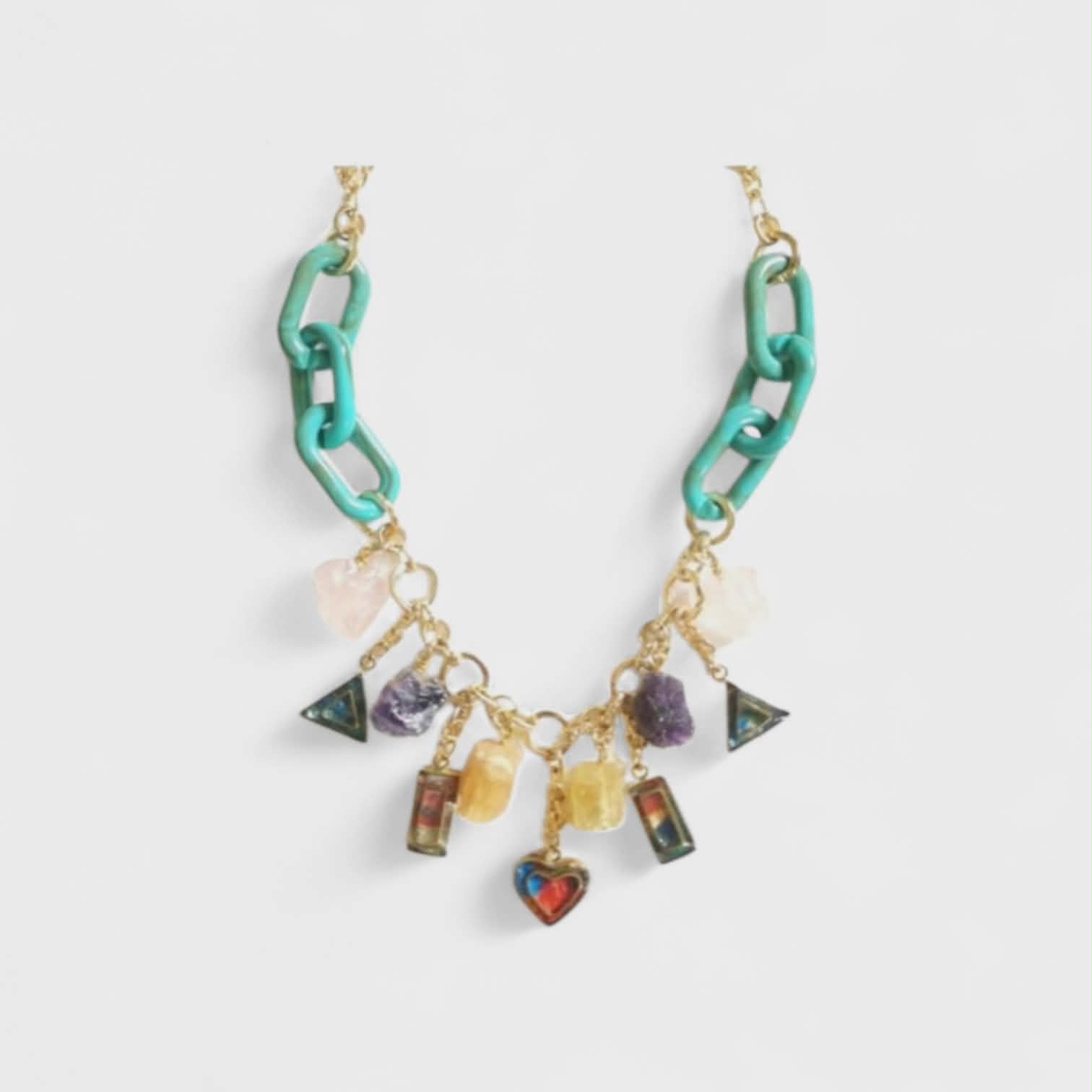 Turqiose color acrylic chain with charms made of upcycled plastic sheet from disposed grocery bags encased in brass accented with raw semi-precious stones.