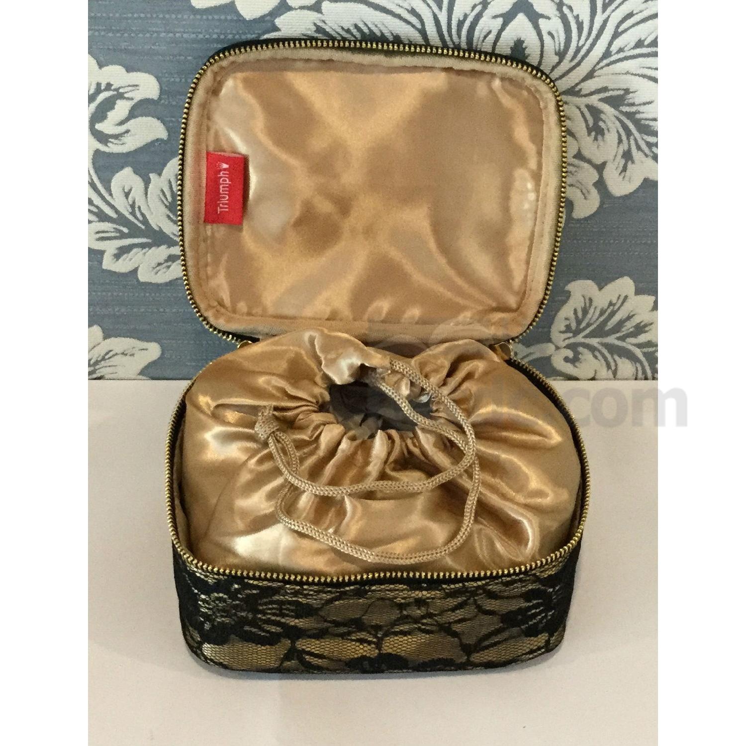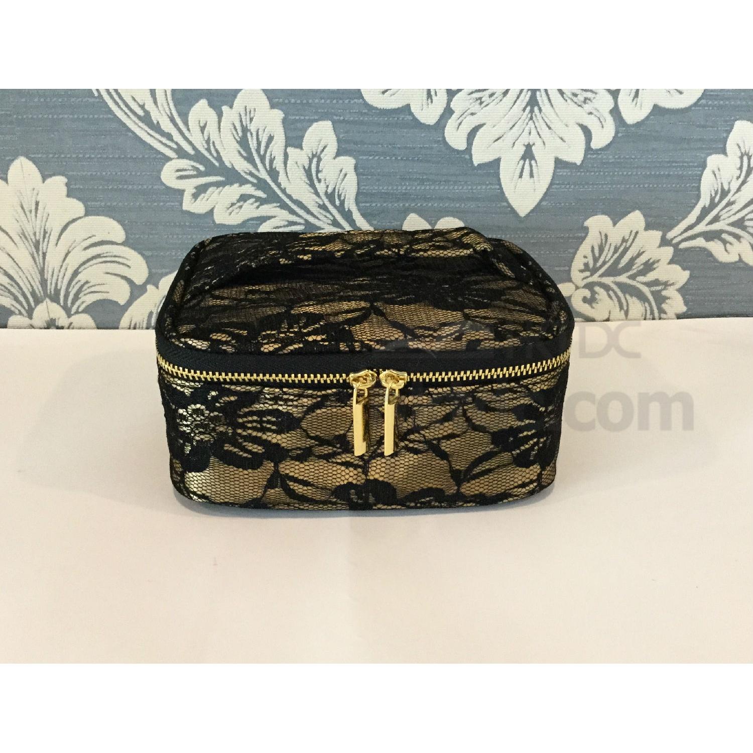 Elegant black lace and soft satin fusion. Perfectly with a drawstring bag inside for protecting your beloved cosmetics or jewelry.