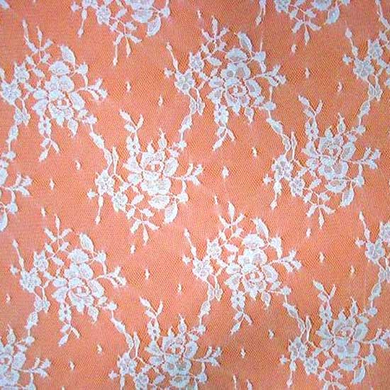 The lace fabric features an orange background with exquisite white flower patterns. It is meticulously crafted with high workmanship for exquisite details. This lace fabric is suitable for ladies' fashion designs.